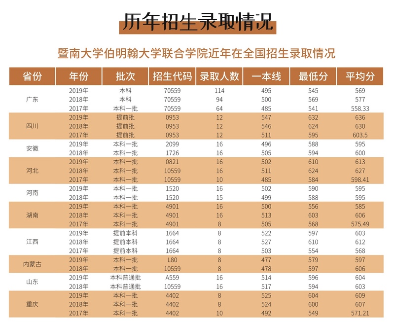 详情请关注《暨南大学2020年本科招生章程》、各省报考指南和暨南大学网站(www.jnu.edu.cn)中的“招生就业”、暨南大学伯明翰大学联合学院网站(birmingham.jnu.edu.cn)中的“招生就业”栏目以及暨南大学伯明翰大学联合学院微信公众号。